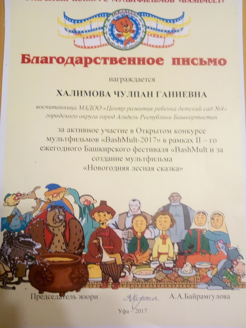 За активное участие в Открытом конкурсе мультфильмов "BashMult-2017" и за создание мультфильма "Новогодняя лесная сказка"