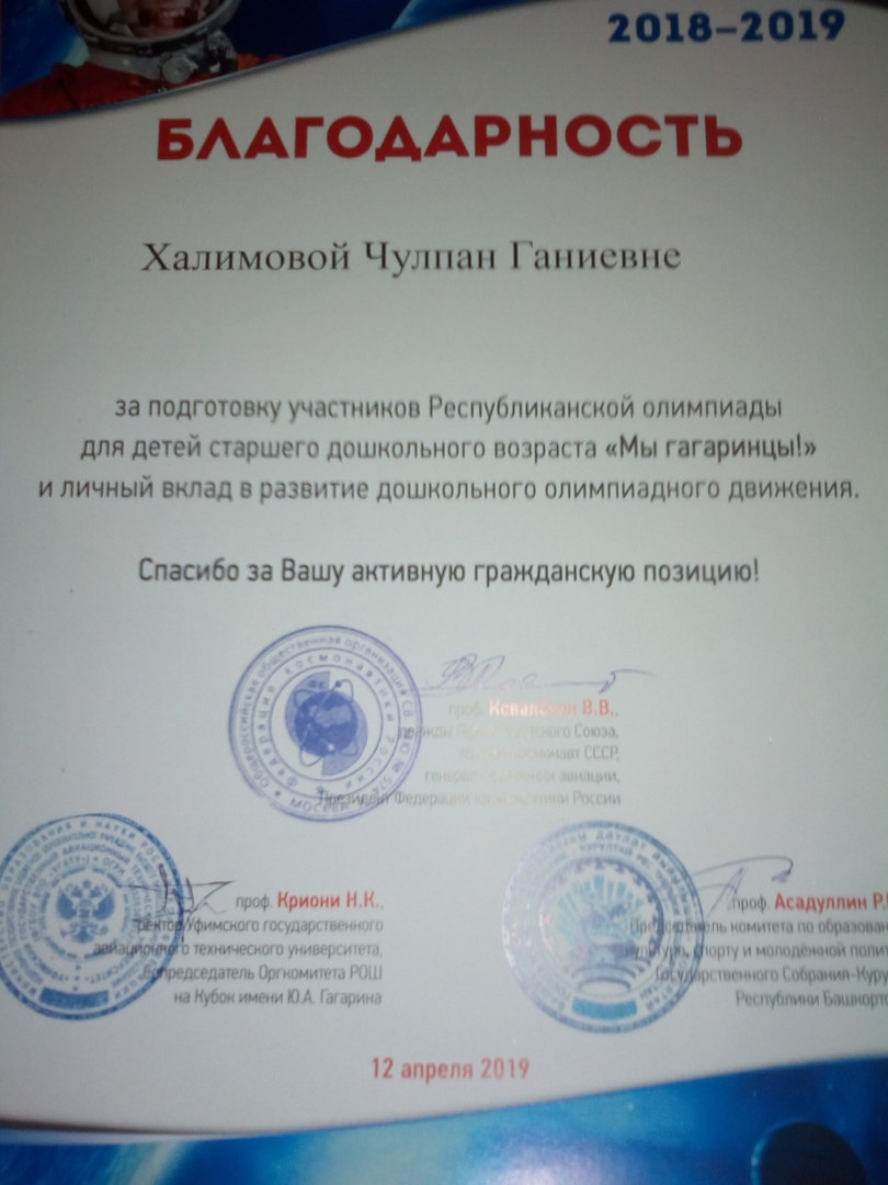 За подготовку участников Республиканской Олимпиады для детей старшего дошкольного возраста "Мы- гагаринцы!"